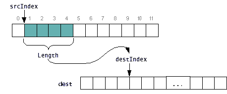arguments indicate the array to copy from and the array to copy to. The three integer arguments indicate the starting location in each the source and the destination array, and the number of elements to copy. This diagram illustrates how the copy takes place:The following program, ArrayCopyDemo