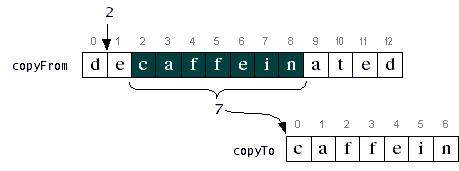 method takes the "caffein" out of "decaffeinated", like this:Note that the destination array must be allocated before you call arraycopy