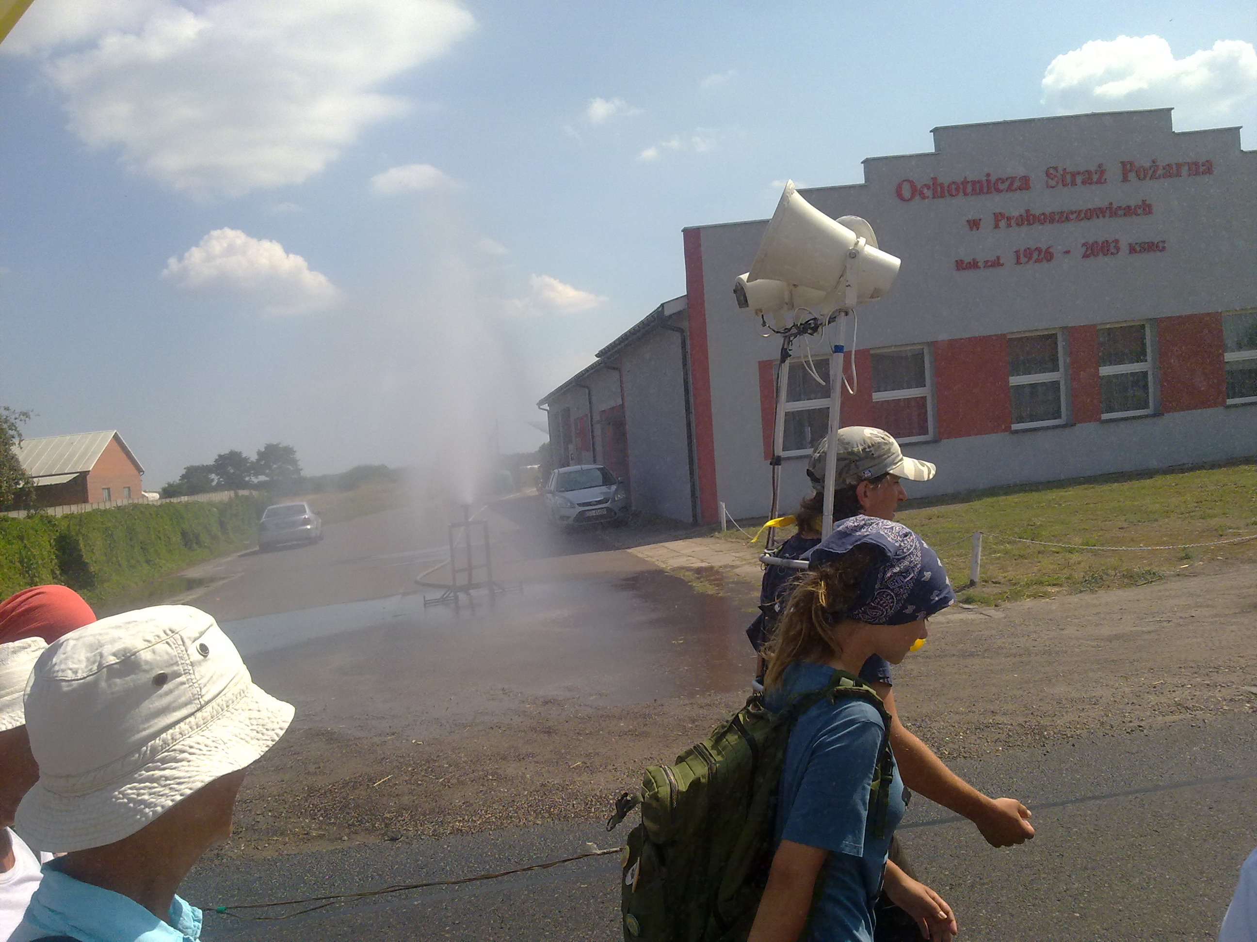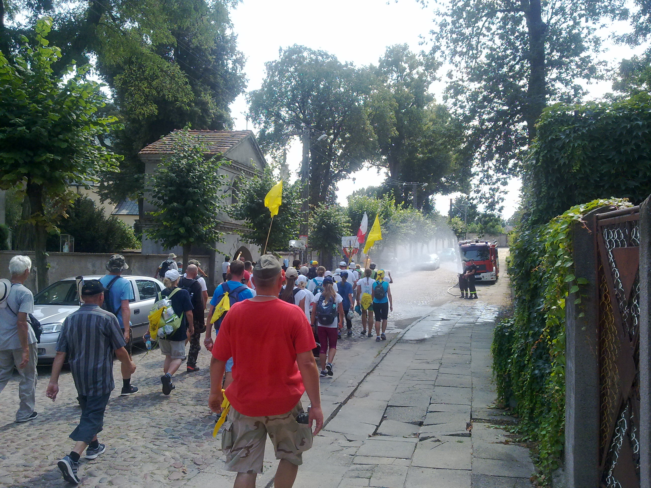 W drodze do Warty straż pożarna dla ochłody fundowała nam kurtynę wodną – tu przy remizie w Proboszczowicach…