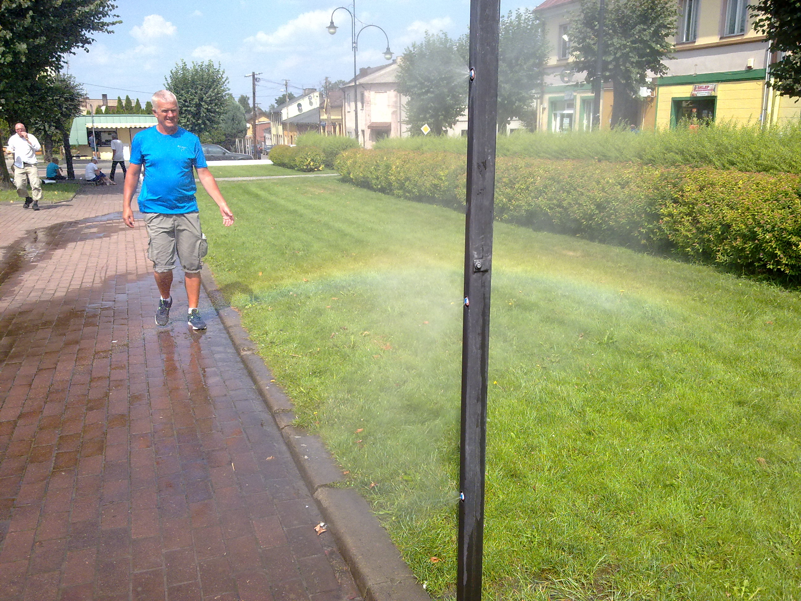Na rynku w Warcie stała instalacja kurtyny wodnej (identyczna jest po drugiej stronie rynku), przez którą przechodzi brat Mietek
