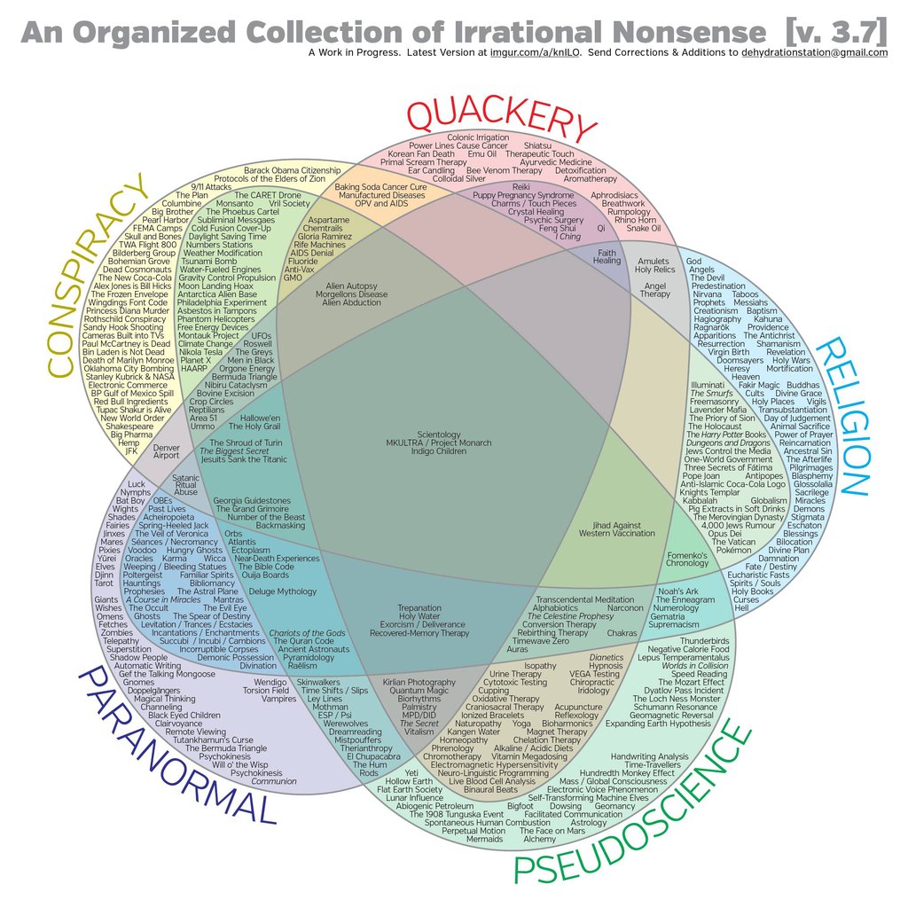 Infografika pokazująca liczne kolekcję irracjonalnych nonsensów, teorii spiskowych, pseudomedycyny, fenomenów paranormalnych i religijnych.