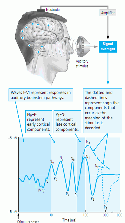 Charakterystyczne sygnały dla reakcji poznawczych na pierwotny sygnał pojawiają się po 200-300 milisekund (odcinek P200 i P300), wzrost amplitudy proporcjonalny do stymulacji. Reakcja P300, czyli po upływie 300 milisekund zależy od stanu wewnętrznego, jest swojego rodzaju "echem".