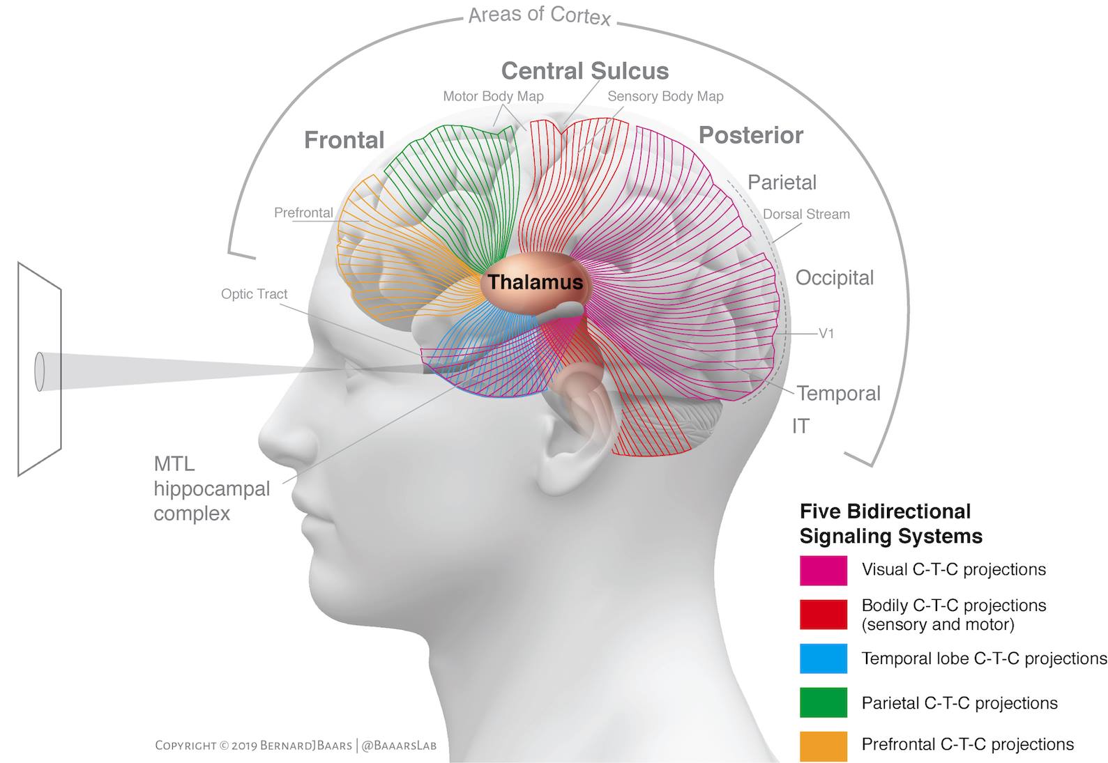 Warstwy neuronów we wzgórzu można oznaczyć w zależności od ich połączeń z korą mózgu. Połączenia są dwustronne, określane jako pętle wzgórzowo-korowe. Kora może więc do pewnego stopnia regulować dopływ aktywacji ze wzgórza. Wiąże się to z procesami uwagi wolicjonalnej i spontanicznej.
