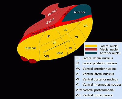 Jądra wzgórza są zwykle dzielone na 4 grupy: przednią, środkową, brzuszno-boczną i tylną.