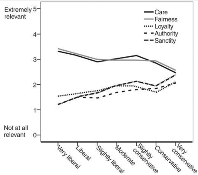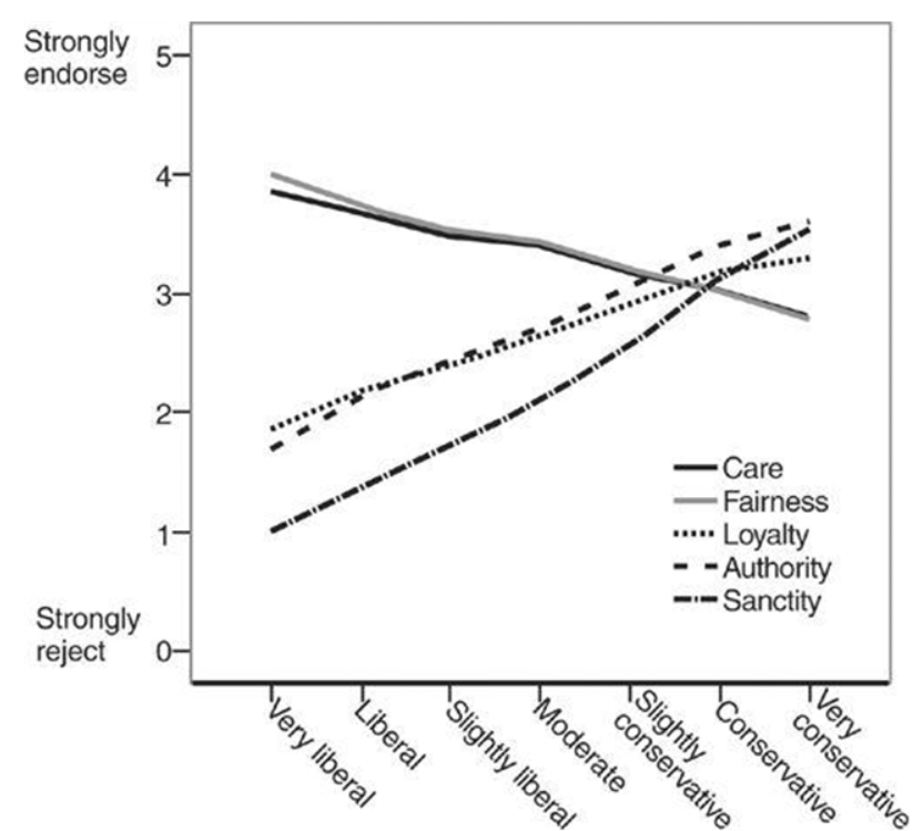postrzegając zagadnienia dotyczące moralności w kilku wymiarach: troski/szkody, sprawiedliwości/oszustwa, lojalności/zdrady, autorytetu/upadku, świętości/upodlenia oraz wolności/zniewolenia. Jest to dobra podstawa do zrozumienia współczesnych zjawisk w polityce na świecie. To dzięki odwoływaniu się do różnych wartości politycy zdobywają głosy określonych grup wyborców.