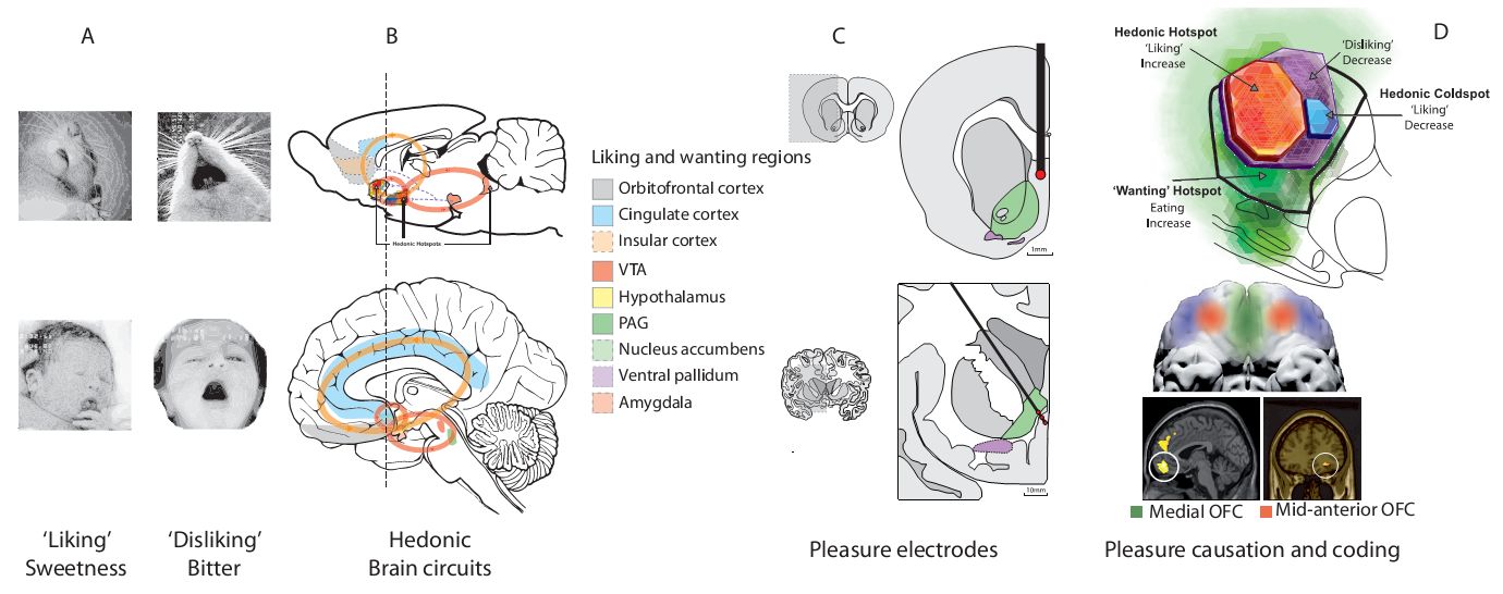 Interpretacja sygnałów jako przyjemności pojawia się w wyniku aktywności kory nadoczodołowej, przedniej części kory zakrętu obręczy i kory wyspy (Berridge, Kringelbach, 2011).