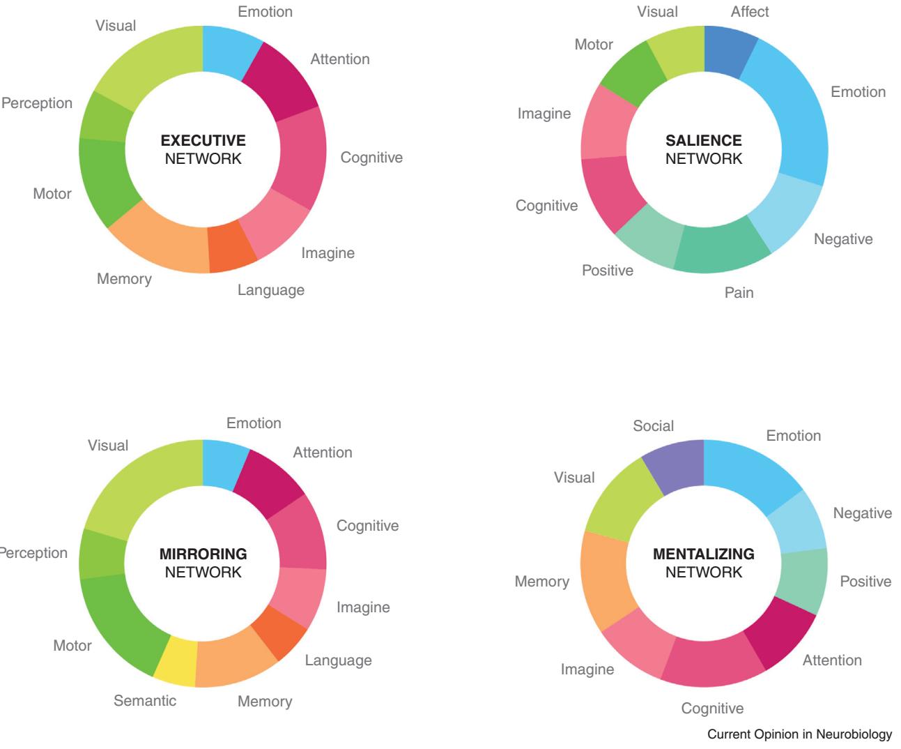 rezultatów neuroobrazowania (zawierającej w połowie 2023 roku ponad 14.000 badań) można przedstawić częstość odwoływania się do funkcji umysłowych dla każdej z czterech sieci rozległych: wykonawczej, istotności, lustrzanej, związanej z myśleniem.