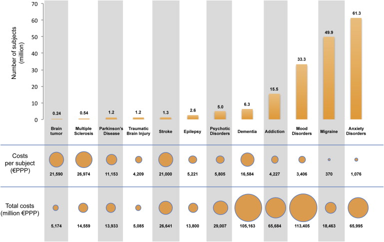 Koszty i liczba osób cierpiących na różne choroby mózgu w Europie w 2010 roku