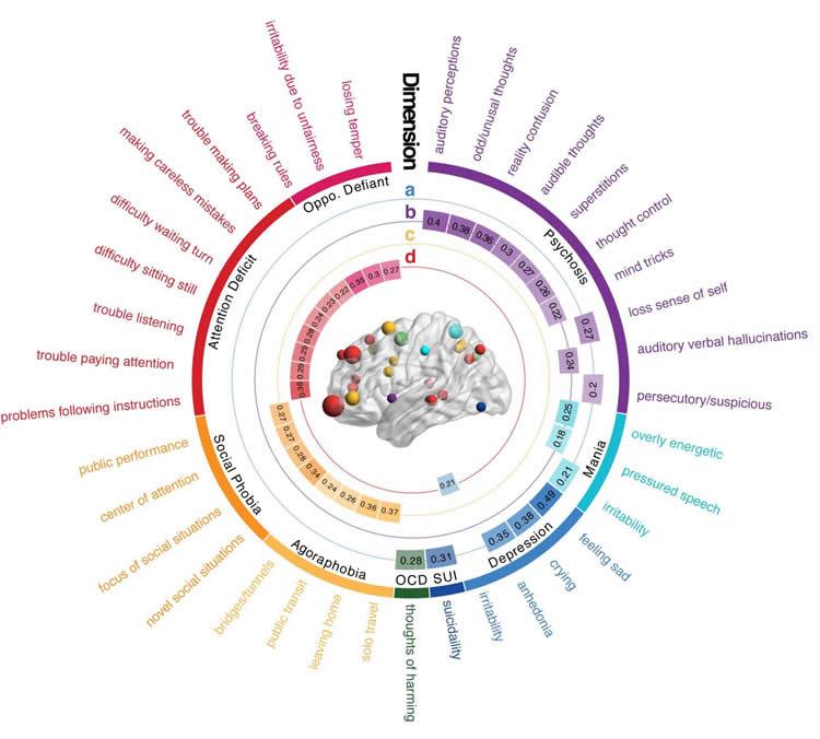 Zaburzenia funkcjonowania sieci rozległych bada konektomika. Mamy coraz więcej danych pokazujących w jaki sposób zaburzenia przepływu informacji związane są ze zmianami struktury konektomu. Powstało pojęcie biomarkerów chorób psychicznych, oparte na strukturze sieci neuronalnej, oraz neurorozwojowych konektopatii (neurodevelopmental connectopathies). Niektóre regiony mózgu odpowiedzialne za kluczowy przepływ informacji związany z patologiami przedstawione zostały w artykule Xia i inn 2018. Rysunek przedstawia główne grupy zaburzeń psychicznych zaznaczając w zewnętrznej warstwie objawy a w wewnętrznej kilka wyróżnionych miejsc w mózgu, które działają odmiennie od normy (liczby odnoszą się do analizy korelacji).