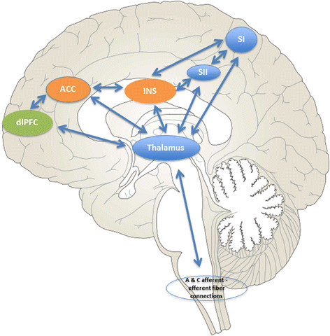W analizie bodźców bólowych bierze udział wiele obszarów mózgu (określa się to jako "macierz bólu", pain matrix), integrując pierwotne odczucie z złożonymi funkcjami dotyczącymi pamięci, uwagi, emocji i samoregulacji zachowania. Sygnały bólowe z nerwów czuciowych dochodzą do wzgórza i stamtąd trafiają do pierwotnej i wtórnej kory somatosensorycznej (SI, SII), kory wyspy (INS), kory przedniej zakrętu obręczy (ACC) i grzbietowo-bocznej kory przedczołowej (dlPFC). Te obszary wzajemnie się pobudzają, może więc dojść do ich aktywacji bez dopływu bodzćów bólowych do wzgórza. Podobnie się dzieje z układem wzrokowym, w którym mogą powstać wrażenia wzrokowe bez dopływu informacji z siatkówki.