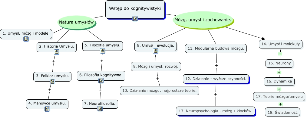 This Concept Map, created with IHMC CmapTools, has information related to: WDK, 16. Dynamika + 17. Teorie mózgu/umysłu, 11. Modularna budowa mózgu. + 12. Działanie - wyższe czynności., 9. Mózg i umysł: rozwój. + 10. Działanie mózgu: najprostsze teorie., 5. Filozofia umysłu. + 6. Filozofia kognitywna., Wstęp do kognitywistyki Mózg, umysł i zachowanie. 14. Umysł i molekuły, 12. Działanie - wyższe czynności. + 13. Neuropsychologia - mózg z klocków., Wstęp do kognitywistyki Natura umysłów 2. Historia Umysłu., Wstęp do kognitywistyki Mózg, umysł i zachowanie. 11. Modularna budowa mózgu., 15. Neurony + 16. Dynamika, Wstęp do kognitywistyki Mózg, umysł i zachowanie. 8. Umysł i ewolucja., Wstęp do kognitywistyki Natura umysłów 5. Filozofia umysłu., 14. Umysł i molekuły + 15. Neurony, 17. Teorie mózgu/umysłu + 18. Świadomość, 8. Umysł i ewolucja. + 9. Mózg i umysł: rozwój., Wstęp do kognitywistyki Natura umysłów 1. Umysł, mózg i modele., 3. Folklor umysłu. + 4. Manowce umysłu., 6. Filozofia kognitywna. + 7. Neurofilozofia., 2. Historia Umysłu. + 3. Folklor umysłu.
