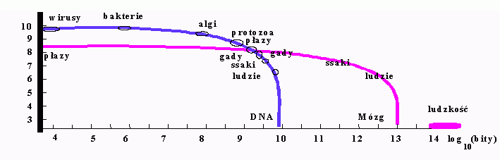 | Ilość informacji genetycznej (w bitach) wykreślona w zależności od daty powstania (linia niebieska), oraz ilość informacji pozagenetycznej, gromadzonej w mózgach (linia czerwona). Na osi pionowej czas w latach w skali logarytmicznej. |