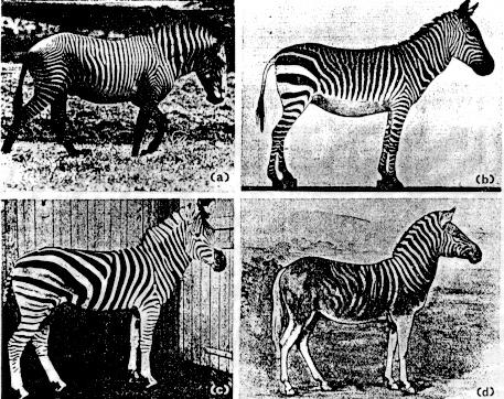 Płód zebry ma ciemną skórę, dopiero przed samymi narodzinami pojawiają się paski; w toku ewolucji potomstwo zostawiło najwięcej zebr, które miały białe plamy a później plamy łączące się w paski i w końcu zostały tylko zebry w paski.
