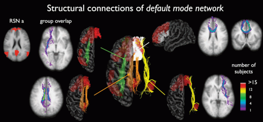 Dzięki traktografii (uśrednione wyniki dla 26 osób) widać białą materię (długie aksony) łączące obszary DMN: pomarańczowe - trakt zakrętu obręczy; zielone (17/26) i żólte (19/26) - pęczek czołowo-potyliczny; niebieski (26/26) - kolano (przedni część) spoidła wielkiego (genu of the corpus callosum ).