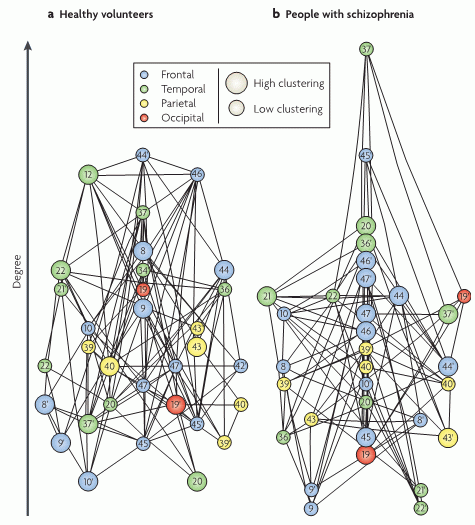 Zmiany w sieciach rozległych widoczne są w takich chorobach psychicznych jak schizofrenia.