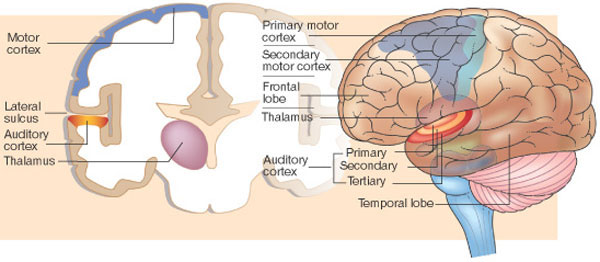 pierwotna kora słuchowa => kora przedruchowa.