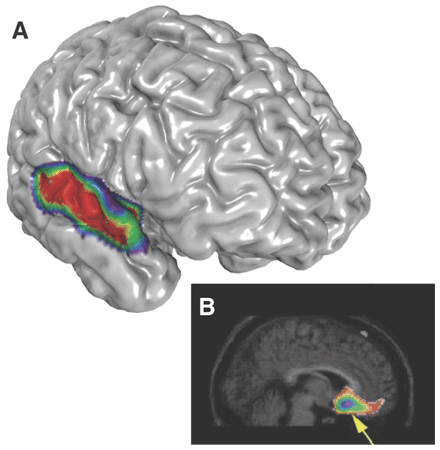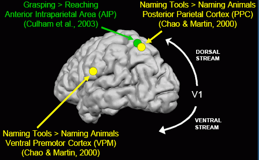 Widzenie słowa i liczenie znajdujących się w nim sylab wywołuje całkiem inne pobudzenie niż widzenie i zastanawianie się nad znaczeniem słowa. Koncepcja narzędzia, którym potrafimy się posługiwać: obszar połączony z somatyczną i wzrokową korą sensoryczną, korą ruchową, a więc blisko ośrodków przetwarzających sygnały o ruchu ręki i analizujących wzrokowe sygnały związane z ruchem. |