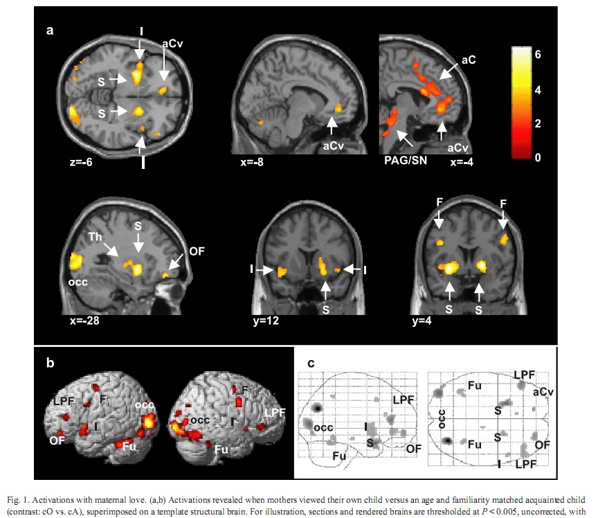 Bartels & Zeki, 2004: (a,b) Różnice aktywacji przy oglądaniu własnego dziecka względem innych znajomych dzieci.