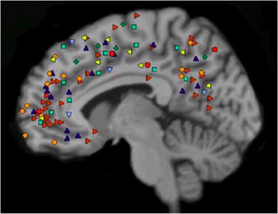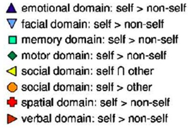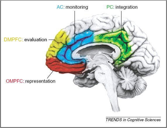 (Cortical Midline Structures, CMS), są siedliskiem procesów odnoszących się do „ja” w testach werbalnych, przestrzennych, emocjonalnych, rozpoznawania twarzy. Dobrze ukryte, rzadko ulegają uszkodzeniom, pośredniczą w komunikacji pomiędzy układem limbicznym, pniem mózgu i korą. Proto-ja: ciało, autobiograficzne ja: pamięć; społeczne ja: relacje. Eksperymenty robi się badając aktywność struktur mózgu w sytuacjach emocjonalnych odnoszących się do "ja" lub innych, wspomnieniach, lokalizacji przestrzennej, relacjach społecznych, prezentacji twarzy i zdjęć swoich i innych. Reprezentacja tych pojęć jest dość rozproszona w CMS. |