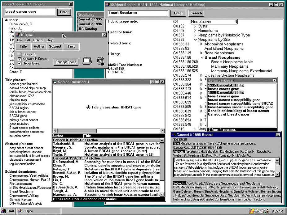 w prawym górnej części, stwierdzając, że szukane pojęcia są bardzo szerokie (zauważ, że "breast cancer" nie pojawia się jako pojęcie). Nastepnie używa bardziej precyzyjnych pojęć dostepnych w przestrzeni koncepcji, związanych z rakiem. W przestrzeni koncepcji może wpisać "breast cancer gene" (u góry po lewej) i otrzymuje nazwiska autorów, tytuły,