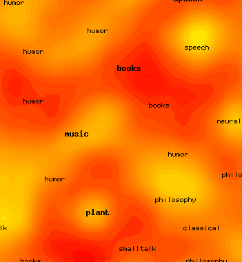 W wyniku takiego pobudzania algorytm uczenia sieci Kohonena przypisze elementom tej sieci takie wektory, które będą zbliżone do wektorów symboli o podobnym znaczeniu, umieszczając te symbole obok siebie na mapie. Podanie mapie semantycznej wektora reprezentującego postać ortograficzną (i fonetyczną) symbolu spowoduje największe pobudzenie się tych jej elementów, które odpowiadają za postać semantyczną, i nieco mniejsze pobudzenie elementów powiązanych semantycznie z przedstawionym symbolem. Jak widać na rysunku poniżej chociaż na mapie ortograficznej a) i mapie fonologicznej b) symbole nie są ze sobą powiązane to na mapie semantycznej możemy zauważyć powstawanie kategorii, obejmujących kilka symboli położonych blisko siebie.