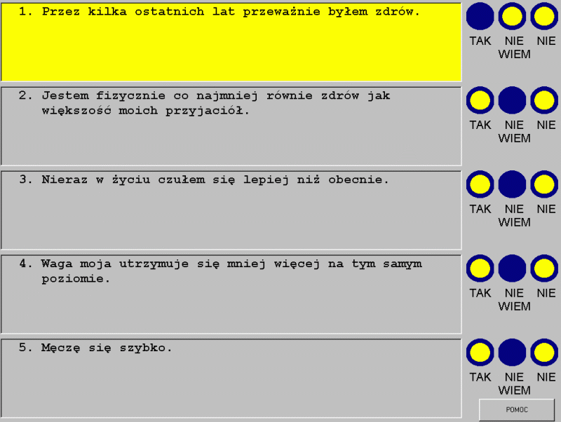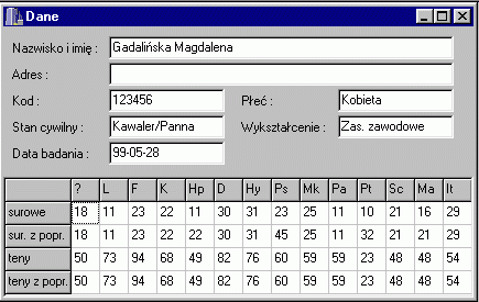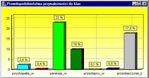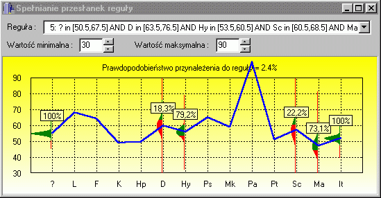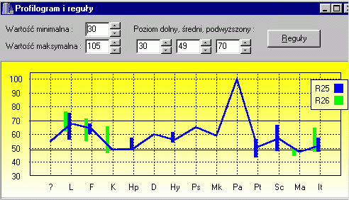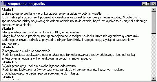 Display scales in a “psychogram”, interpreted by skilled psychologists diagnosing specific problems; show rules that are true for this case. Rules are derived from data collected in the Academic Psychological Clinic of Nicolaus Copernicus University and in several psychiatric hospitals around Poland. |