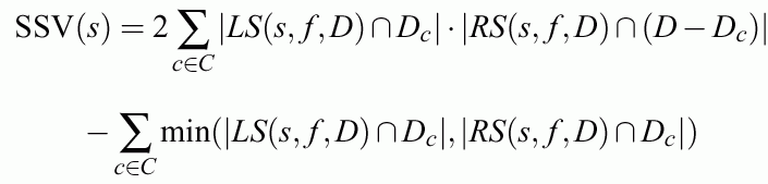 The SSV criterion for the test s counts the no. of elements from class c in the left set and from all other clases in the right set, summing over all classes: