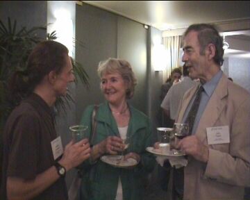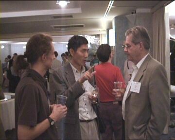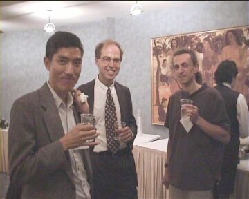 Let's party! The evening reception: Marco Gori (program chairperson - Italians are politically correct) optimizing the wine selection (muscat won); Marco with Deliang and Norbert Jankowski enjoying his selection.