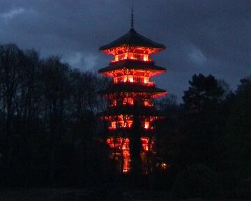 Night visit to royal orangeries (opened only for 3 weeks in Spring); the Japanese Tower in the distance, reflected in the pond.