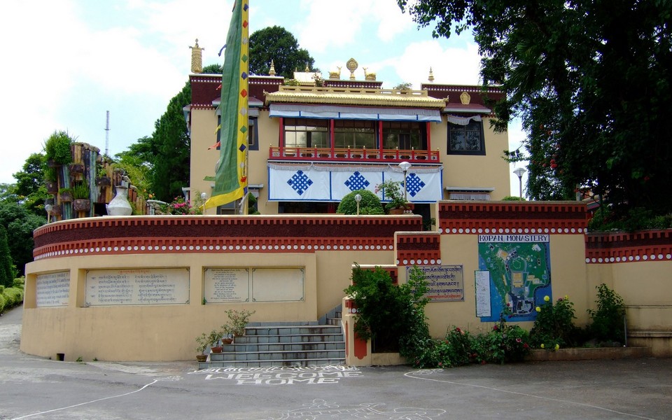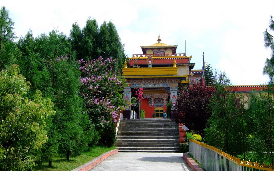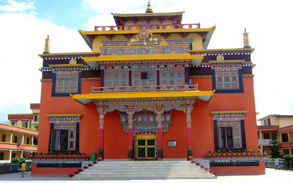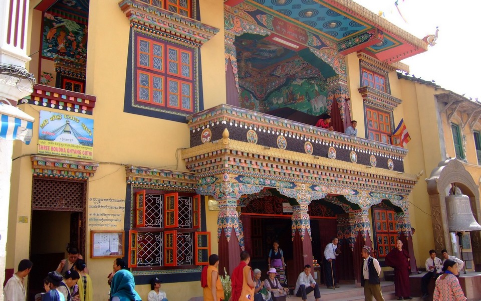 The 8-spikes Dharma wheel and two deers are above the entrance