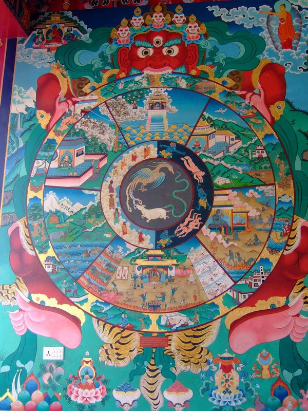 The wheel of life: in the center a pig for ignorance, a snake for envy/hatred, a cock for lust/greed.