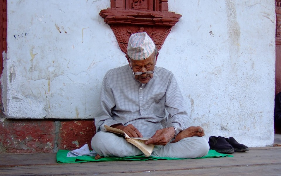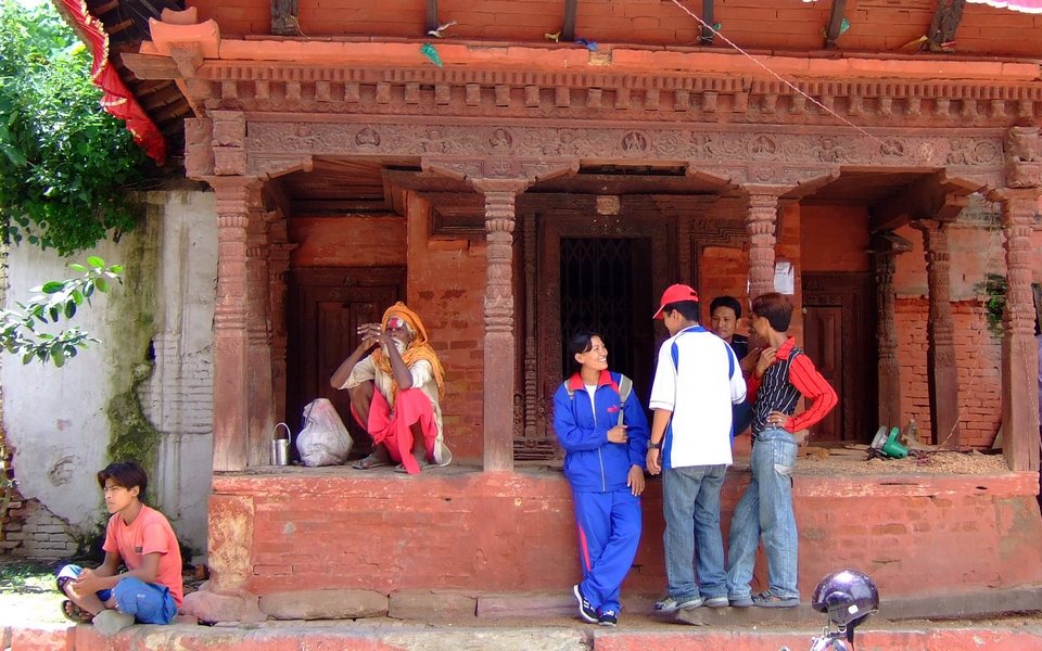 Studing in the middle of a crowd in shade of a temple