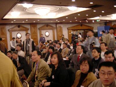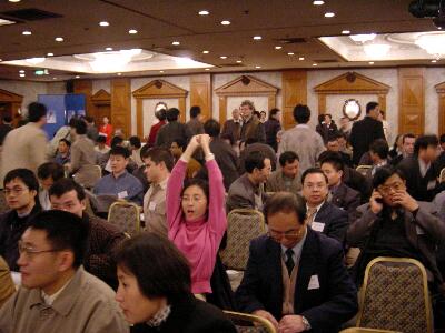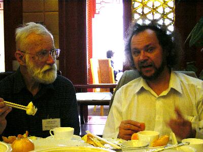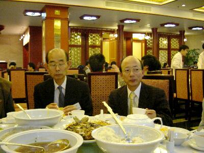 Time for lunch: K. Fukushima meditates and M. Ishikawa watches.