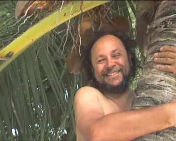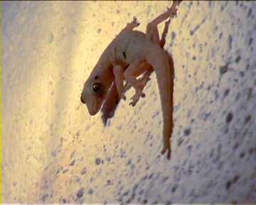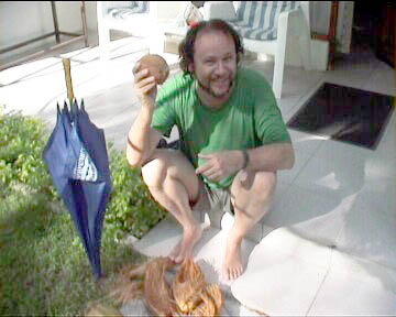First climb the palm, than use an umbrella to get the coconut. Gecko watches this from the ceiling.