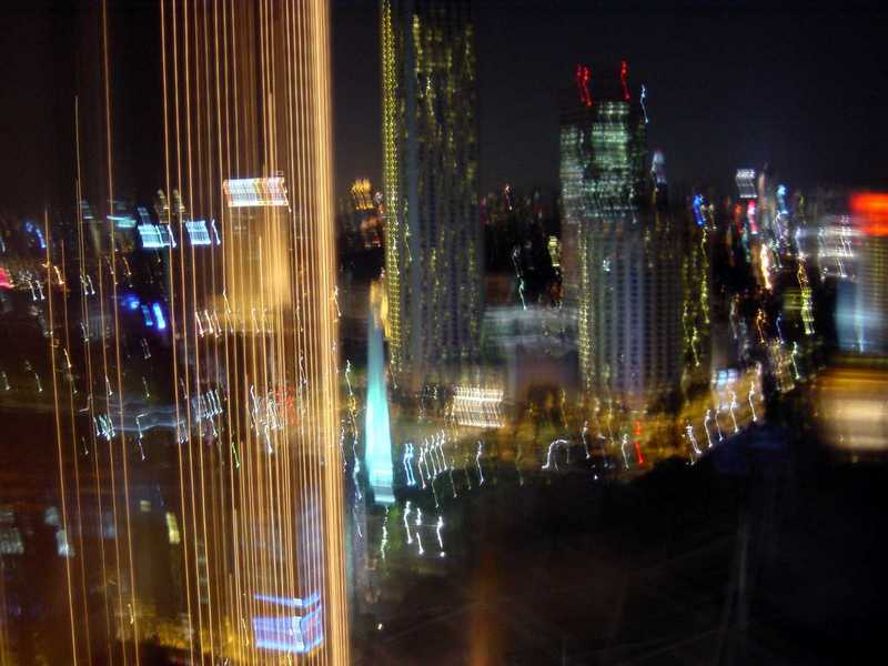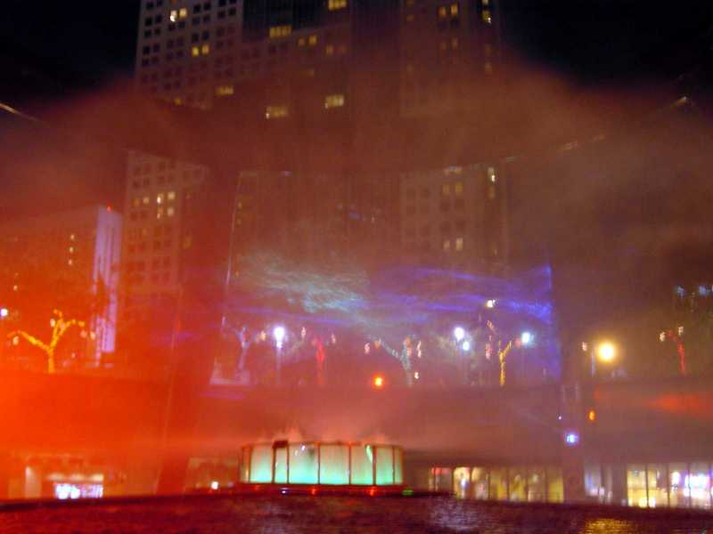 Fountain of Wealth in the Suntec City in the night, where a laser paints pictures on the water screen;