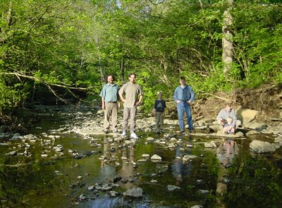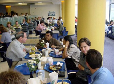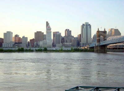 Cincinnati from the Kentucky side of the Ohio river; Rafal (left) and Jarek in front of Children's Hospital Research Foundation. Lunch - time for discussions.