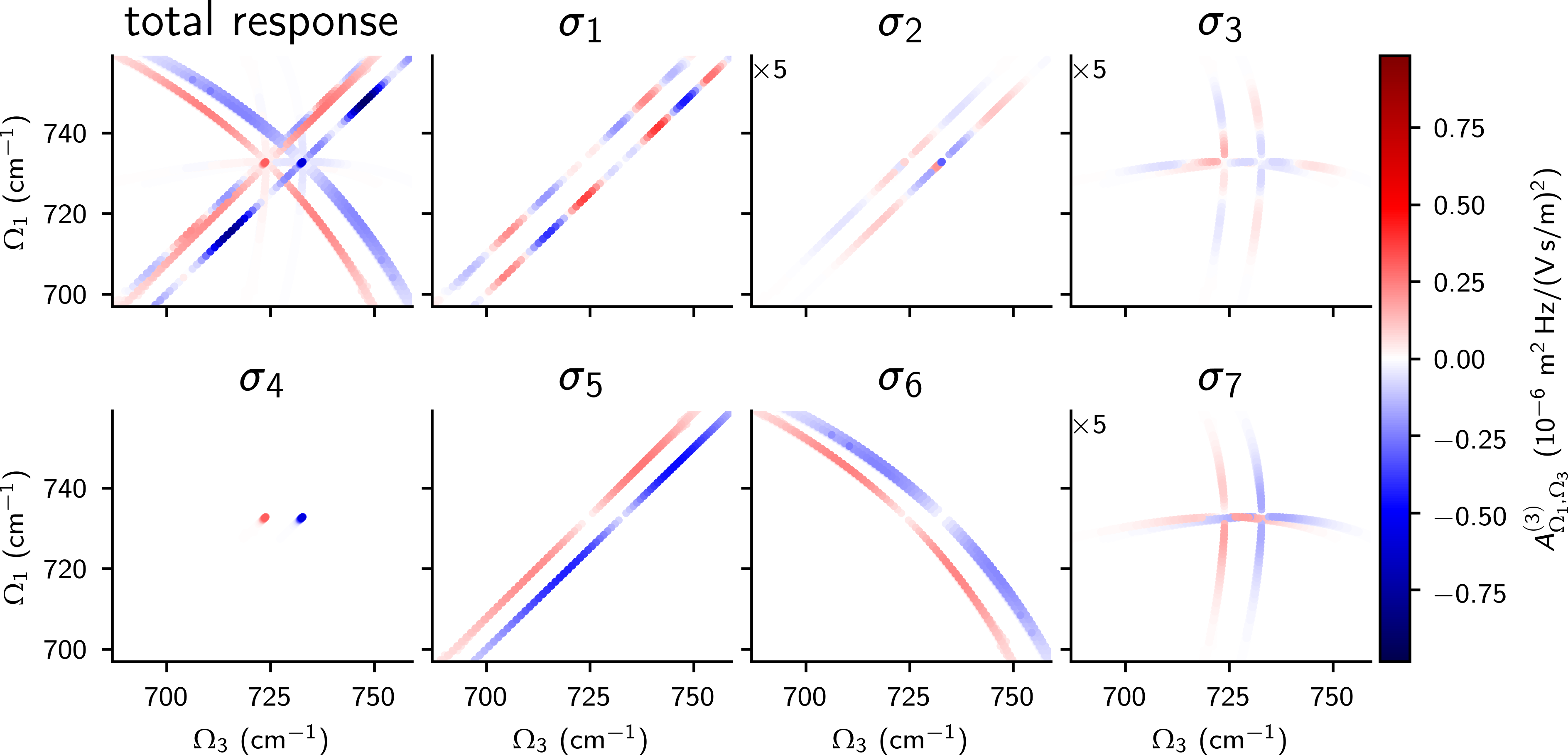 We have developed a theory and a Python library to describe the polarization dependence of 2DIR gas-phase spectra4. Using these tools we discovered new polarization conditions specific to the gas phase, which allow us to selectively suppress subsets of third-order pathways in 2DIR spectra. Assuming separation of rotational and vibrational degrees of freedom, all third-order nonlinear pathway amplitudes can be separated into 7 distinct classes (\(\sigma_i\))5 with regards to their dependence on pulse polarizations. The general formula is given by: