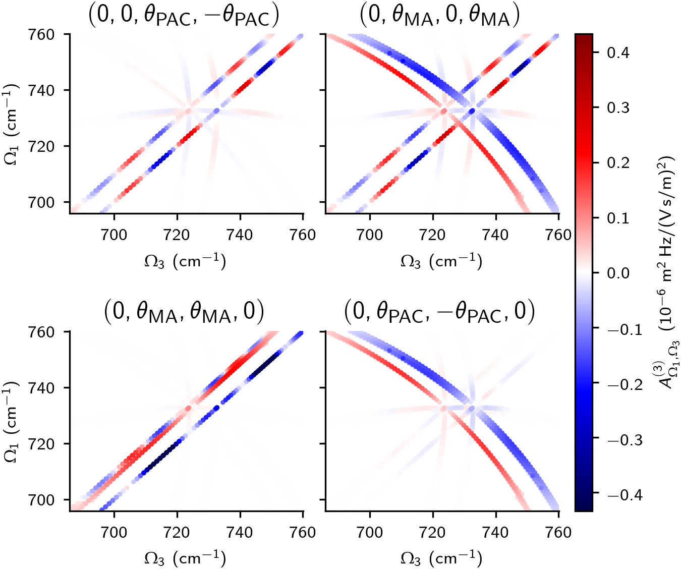 Knowing the polarization dependence, we presented polarization conditions that suppress parts of the total molecular response. Figure below demonstrates four of these conditions with non-rephasing methyl chloride spectra. The table below gives the amplitudes of \(R\)-factors for each polarization sequence and for each class, which explains the appearance of the spectra.