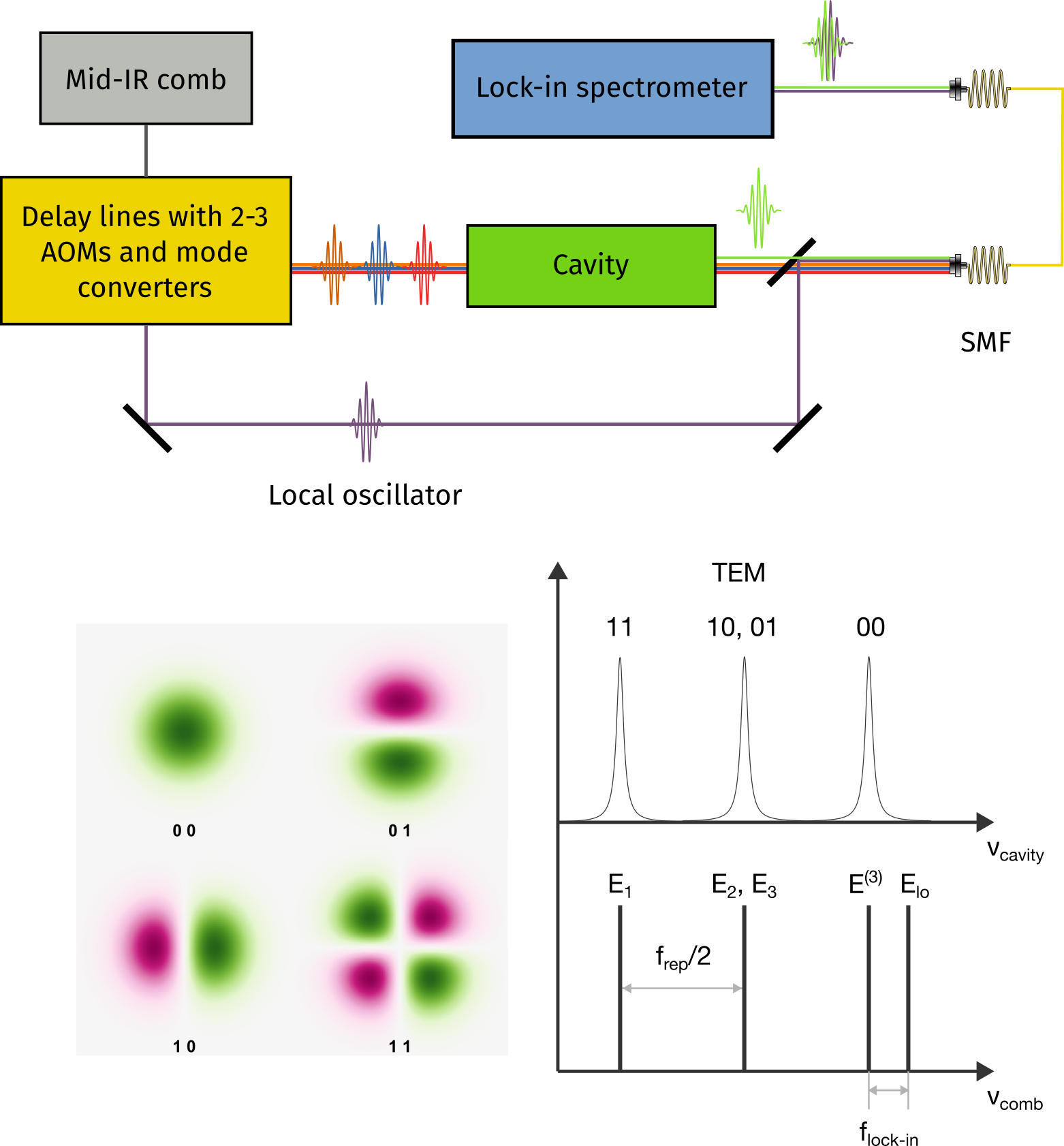 We will use our home-made Yb:fiber oscillator and a mid-infrared optical parametric oscillator as the seed comb as seen in the figure above. Delay lines will split the original pulse train into 4 separate pulse trains. Placing acousto-optic modulators and mode converters into appropriate delay line branches will match the transverse spatial profiles and offset frequencies of optical frequency comb beams to higher order cavity modes. The spatial profile of the third-order nonlinear signal will be determined by the product of transverse cavity mode profiles. Adjusting time-ordering of the pulses will make either the rephasing or nonrepashing signal resonant with the fundamental Gaussian mode. The combined signal and the local oscillator beams will pass through a spatial filter (a single-mode fiber) and their heterodyne beat at RF frequencies will be demodulated to obtain the 2DIR spectrum at noise levels close to the shot noise limit.